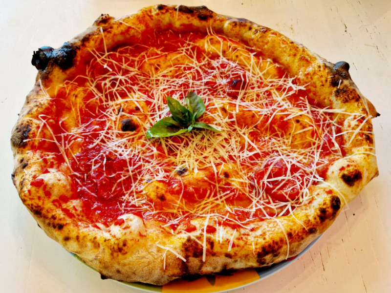 Una delle pizze più antiche pizze di Napoli con filetto di pomodoro Antico di Napoli, scaglie di pecorino bagnolese, basilico