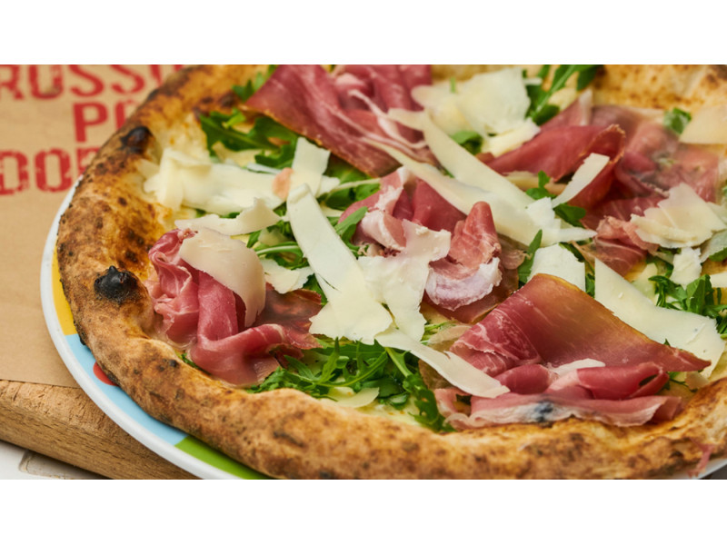Mozzarella con, in uscita dal forno: prosciutto crudo di Parma DOP 18 mesi, rucola e scaglie di provolone Auricchio Stravecchio