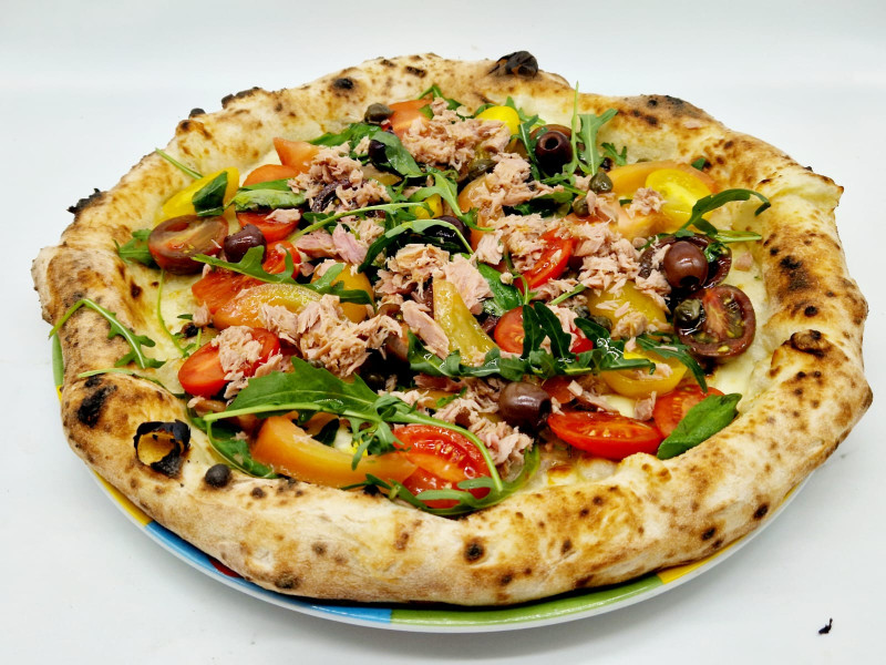 provola affumicata e, in uscita dal forno, rucola, selezione di pomodori, tonno in olio, olive nere e capperi