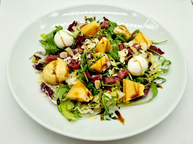 bocconcini di mozzarella di bufala, bianchi e affumicati, rucola, radicchio, insalata verde, tocchetti di melone Cantalupo e prosciutto di Parma DOP in olio, ristretto di aceto balsamico IGP e mandorle tostate