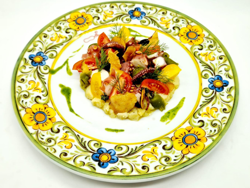 insalata di polpo*, patate schiacciate, pomodoro datterino giallo e rosso, olive, chips di topinambur e olio al limone