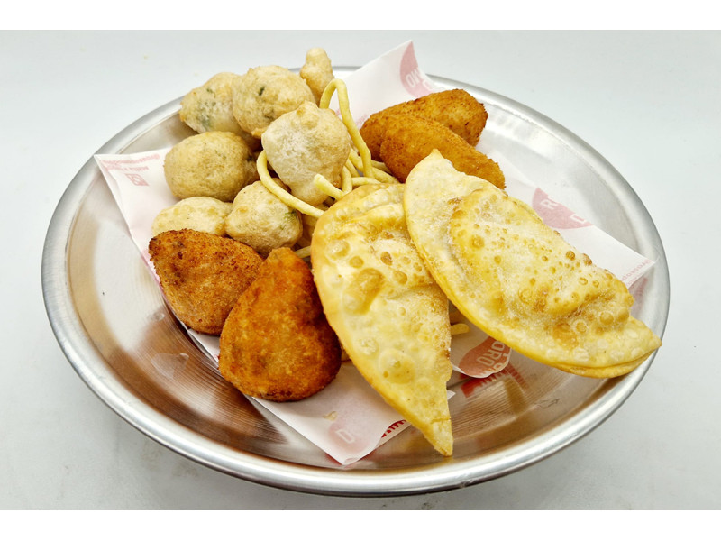 tipico fritto napoletano: 2 crocchè di patate con salame e provola affumicata, 2 arancini di riso, 8 zeppole alle alghe, 2 calzoncini di ricotta, provola e limone