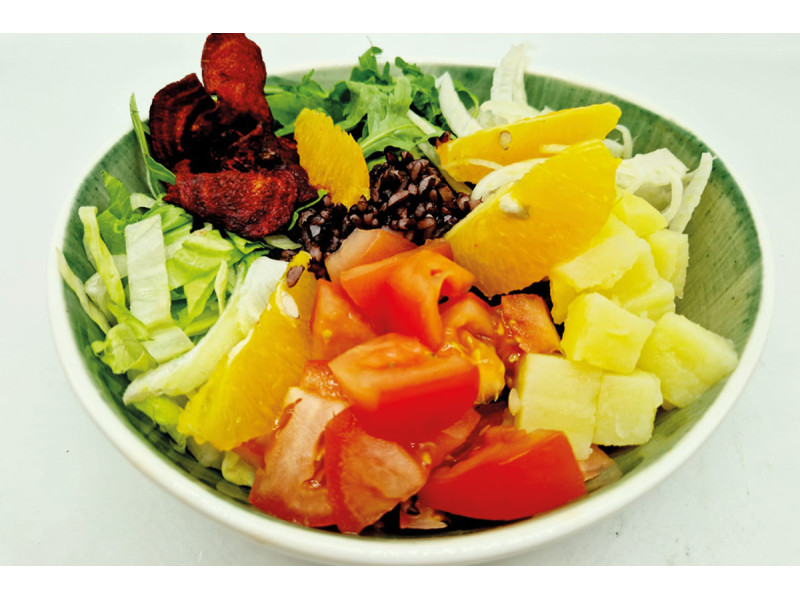 riso nero, insalata verde, pomodoro ramato, chips di barbabietola, rucola, patate, arancia, finocchi, citronette e semi di zucca