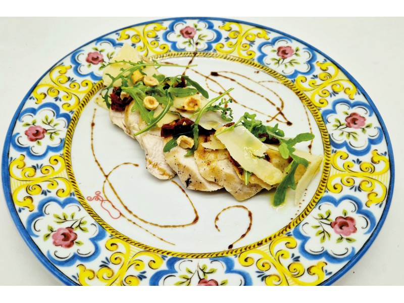petto di pollo grigliato al rosmarino (circa 200g), con pomodori secchi, scaglie di grana, nocciole, rucola e ristretto di aceto balsamico IGP