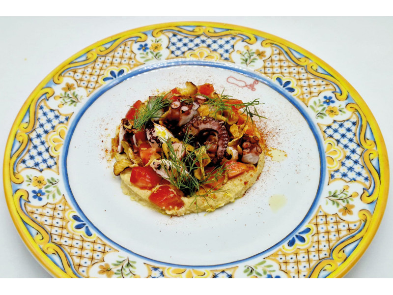 polpo* alla brace su purea di ceci, tapenade di pomodoro, zeste di limone e olio EVO con polvere di peperoncino dolce, chips di topinambur e aneto