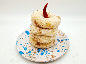 cialda crooccante con montata di ricotta di bufala e crema, zucchero a velo, scaglie di...