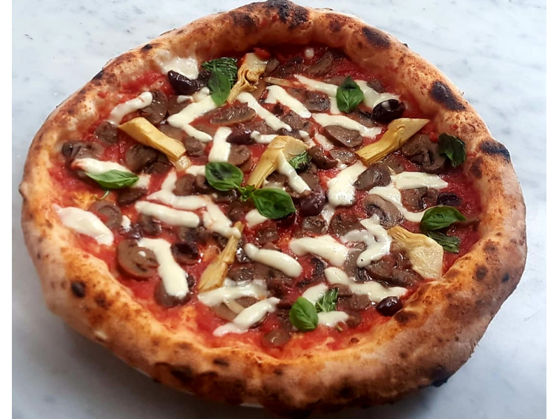 Pomodoro Roma, mozzariso, funghi champignon, carciofini e olive nere